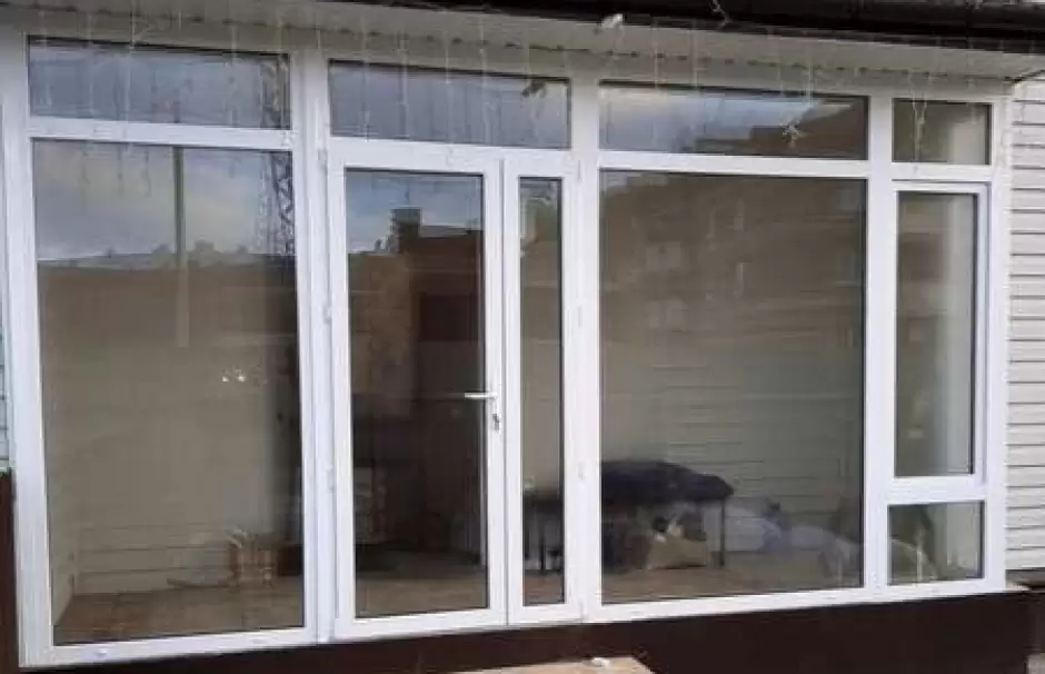 Для остекления входной группы был выбран профиль Montblanc. Пластиковые окна Монблан - это современные и красивые окна. Стандартная прямоугольная конструкция с большими окнами и поворотной дверью с 2-мя створками. Сбоку небольшая поворотная створка. Одинарный стеклопакет.Установка входной группы была выполнена за 1 день.